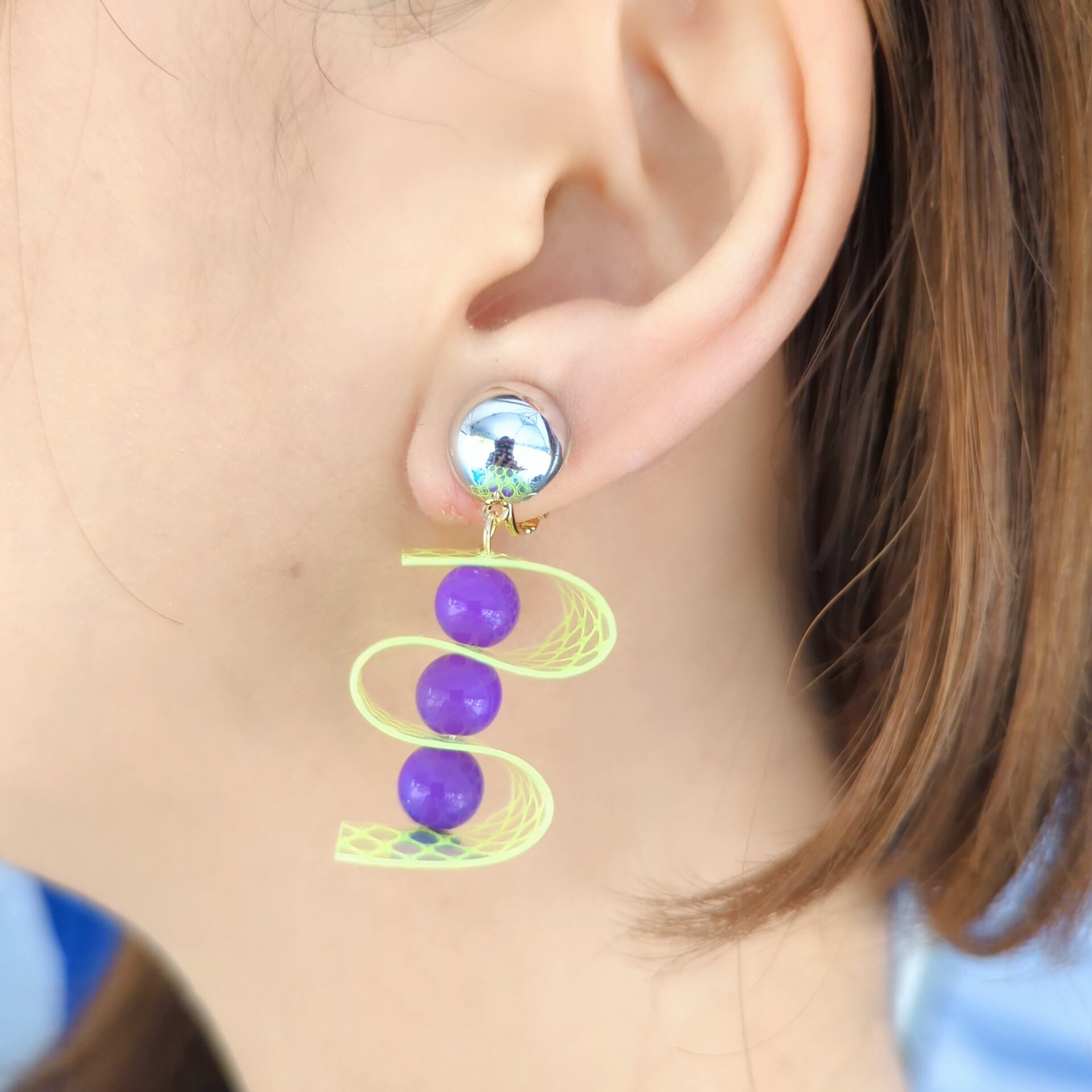 目を引くネオンカラーが大きなインパクトを与えるアシメイヤリングです。シンプルなカジュアルコーデにはもちろん、パーティーシーンでも活躍してくれます。